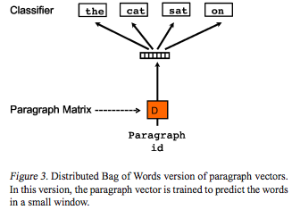 bow of wordsは語順情報を捨てているが、本論文で提唱しているParagraph Vectorは教師なし学習で、多様な長さのテキストから固定長のベクトル特徴を学習する。