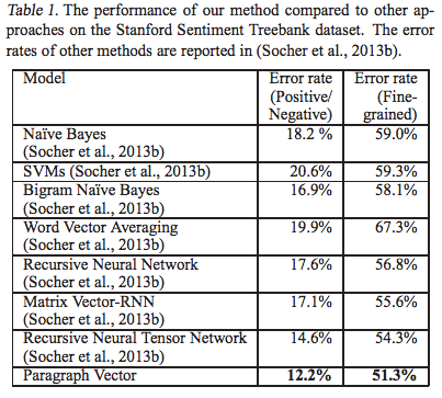 word2vecの拡張のような形で、Paragraphを混ぜ合わせながら、文章中の単語を予測しながら文章自体の分散表現を獲得するというのは面白い手法であった。